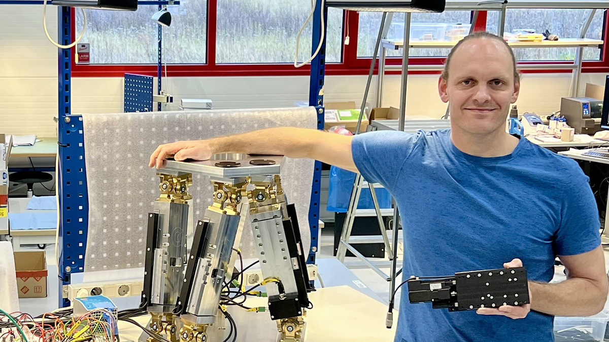 Stefan Plogmaker, holding one of the in-house developed linear stages. To the left is the Heftytec hexapod.