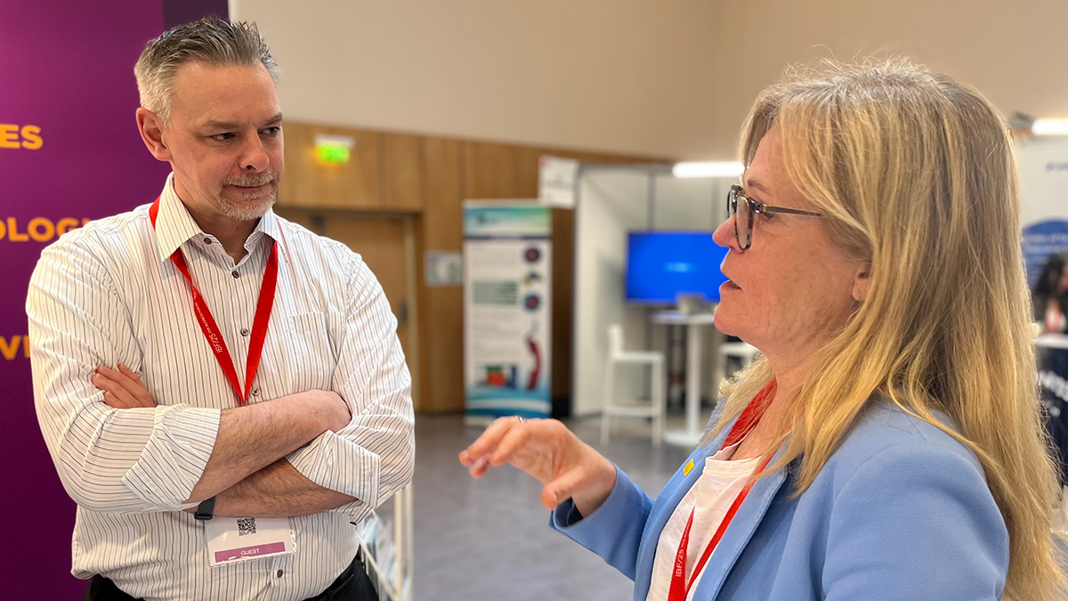 Johan Bäckström from Ahlberg Cameras engaged in an intense conversation with Mikael Nensén from AIT at the Nordic-Baltic Pavilion.