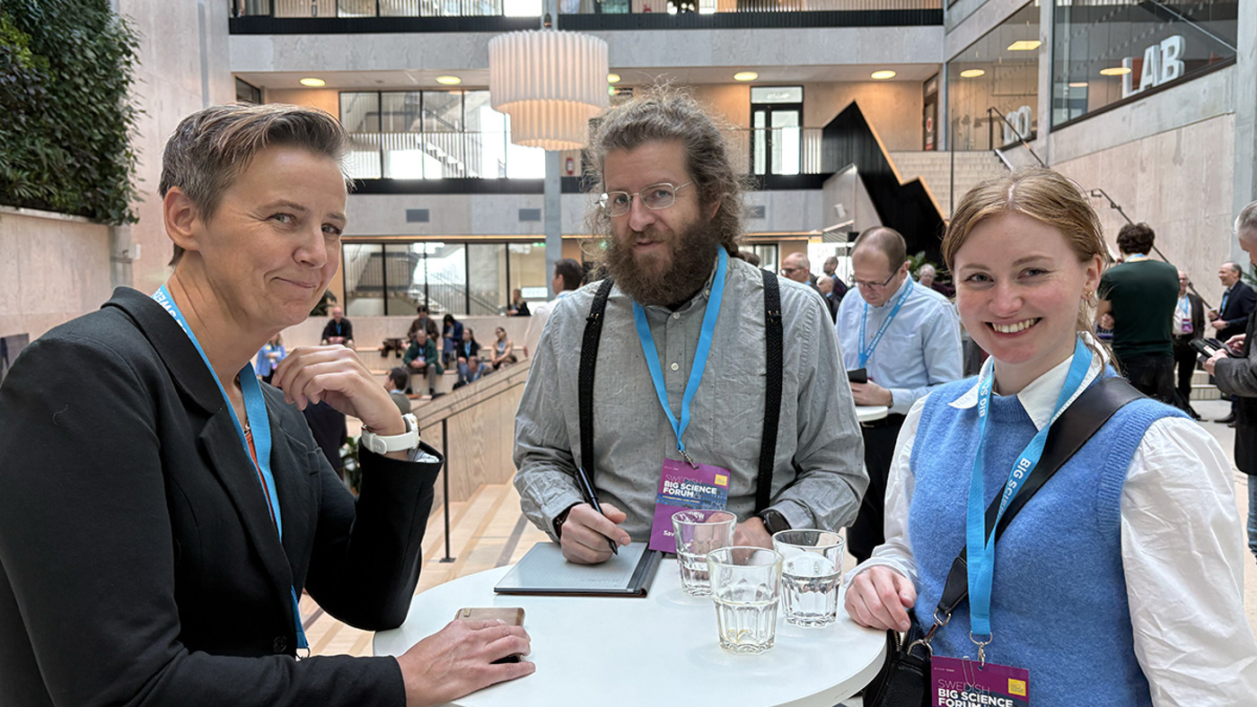 Connect with other Swedish suppliers. Anna Olsson (Scanditronix), Matthew Lawson and Sunniva Jacobsen (Savantic AI Lab) at Swedish Big Science Forum (2026),